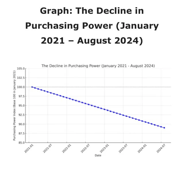 The graph above “The Decline in Purchasing Power January 2021 - August 2024” illustrates the steady decline in purchasing power of those in the Lakes Region. The graph uses 100 as the base value, with each month’s index calculated using the formula outlined above.