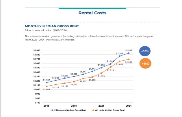 Between 2015-2024 median rents for a 2 BR apartment increased from $1,157 to $1,853. That $1,853 is twice the “affordable rent” for HOUSEHOLDS, 2.5 times the “affordable rent” for males, and 3 times the “affordable rent” for females — as reported above by Wikipedia.