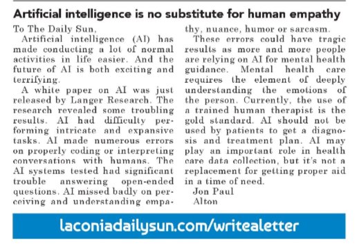 Artificial Intelligence was featured in a Letter to the Editor in The Laconia Sun 09.17.2025. Readers may appreciate its local relevance in the Lakes Region throughout this Blog Post.
